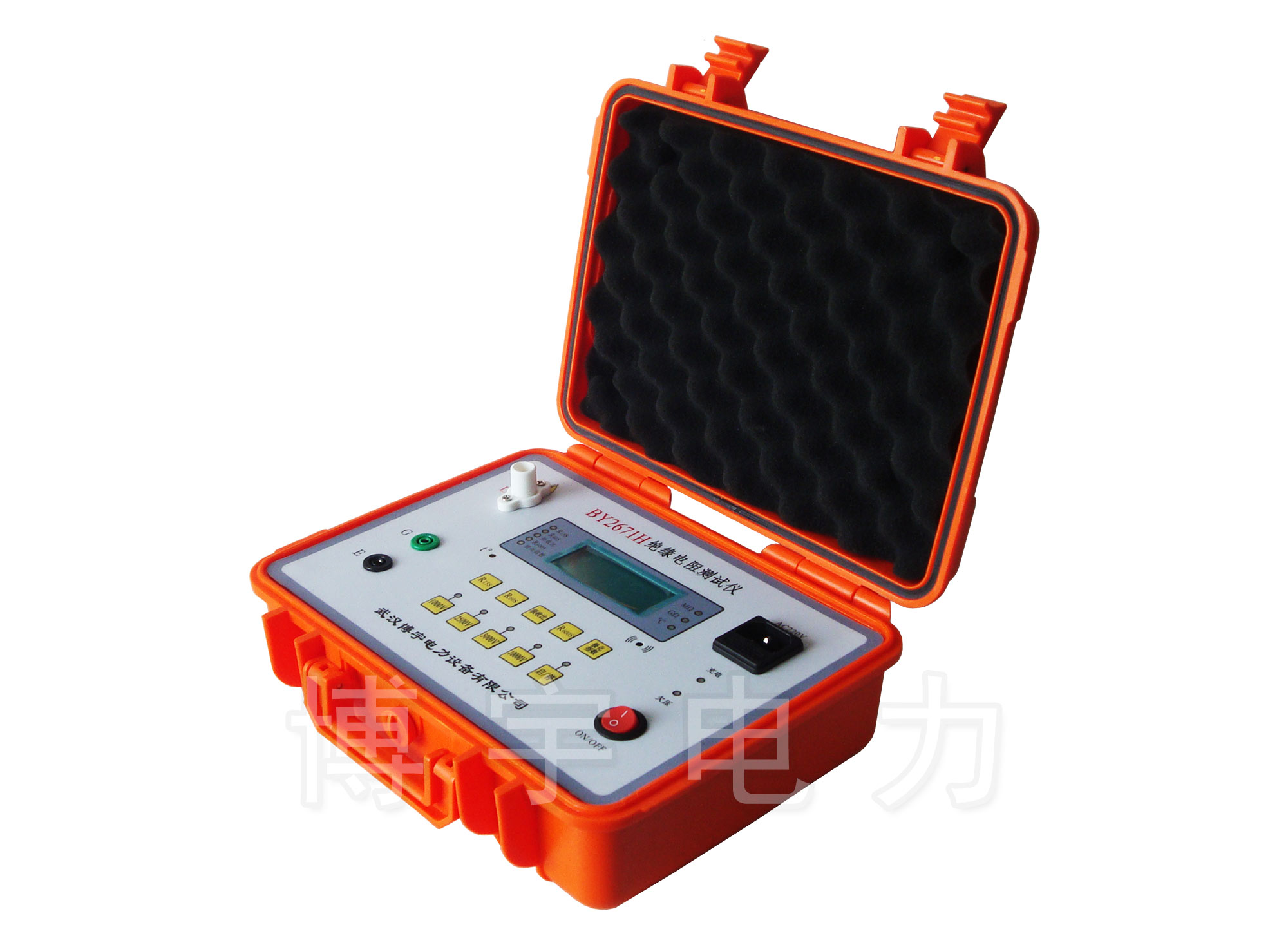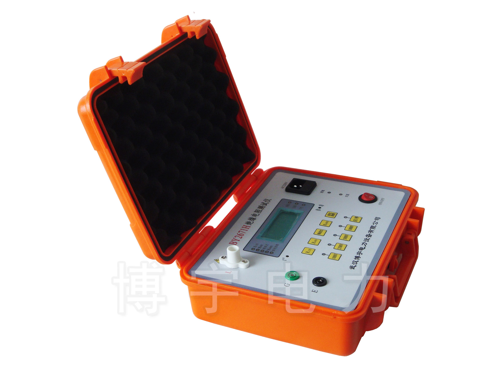 BY2671HP絕緣電阻測試儀采用高壓逆變電路將DC供電逆變為額定高壓輸出1000V、2500V、5000V,10000V施加到被測試品兩端,采用了先進電壓、電流采樣電路,將采樣被測試品兩端的電壓和流經被測試品體內的電流量實行除運算,得到數字量結果輸出到高精度A/D器,將A/D轉換結果輸出MCU電路處理。并由LCD數顯示屏直接讀取電阻值,該A/D轉換器在啟動高壓測試后的第15s、1min、10min時自動進行轉換,并將數據存入數據存儲器;存儲器內的數據可自動或手動調出讀取,也能進行R1min/R15s、R10min/R1min運算,并讀出數值。