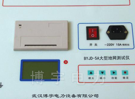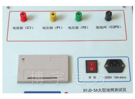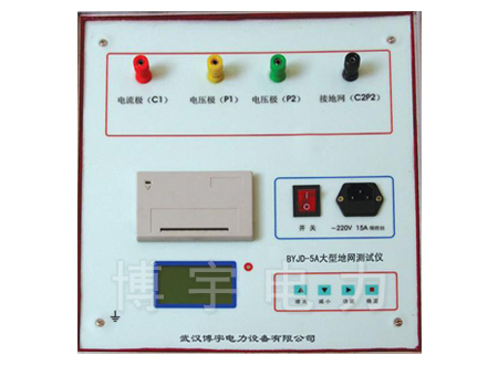BYJD-5A大型地網接地電阻測試儀適用于測試各類接地裝置的工頻接地阻抗、接觸電壓、跨步電壓、等工頻特性參數以及土壤電阻率。本儀器采用異頻抗干擾技術,能在強干擾環境下準確測得工頻50Hz下的數據。測試電流最大5A,不會引起測試時接地裝置的電位過高,同時它還具有極強的抗干擾能力,故可以在不停電的情況下進行測量。
